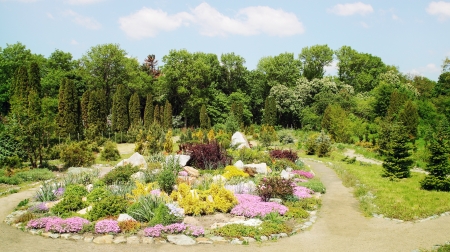 Flower bed with different types of plants against the background of coniferous trees in spring in a botanical garden in Odessa, Ukraine