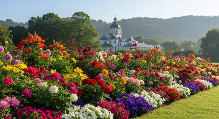 Picturesque flowerbed with vibrant blooms and historic building