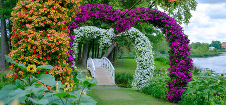 Pakruojis, Lithuania - July 7, 2023: Pakruojis manor flower installation in the shape of a heart. Multicolored petunia flowers Baltic States, Europe.