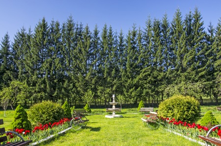Relaxing garden with tulips and a artesian well in center, evergreen trees behind