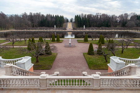Saint Petersburg, Russia, 20.04.2019 Peterhof, spring, Lower Park, the Marly pond, a cascade of gold mountain.