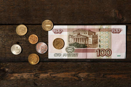 Banknotes of Russian rubles in different denominations, free space for text. View from above. Money. Copy space.