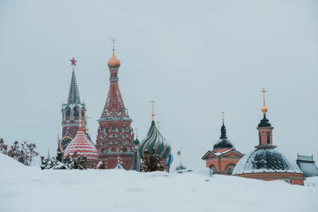 St. Basil's Cathedral in Moscow covered by snow, russian tourist landmark on Red square in winter