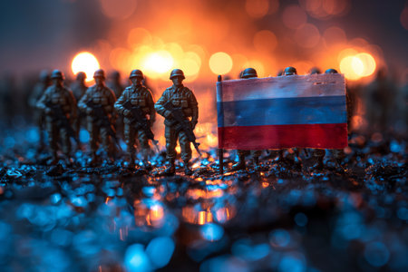 Russia flag on burning dark background. Concept of crisis of war and political conflicts between nations. Military silhouettes fighting scene dark toned foggy background. Selective focus