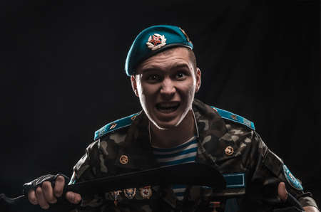 A soldier in military uniform, combat coloring, with scars and bruises screams against the background of smoke, consecrated by a bright spotlight with a black background. Black white contrast portrait