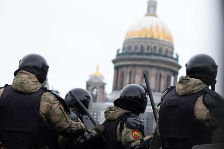 Saint Petersburg, Russia - 31 January 2021: Police army forces squad on street, protests in Russia, Illustrative Editorial