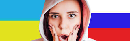 War between Russia and Ukraine. Woman with sad sight, Stop text over Russian flag.