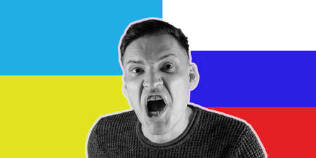 The man is in a state of shock, he shouts against the background of news about the war between Ukraine and Russia and Putins policy