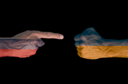 Illustration of a hand with the flag of Russia printed pointing to a fist with the flag of Ukraine printed on a black background. armed conflict
