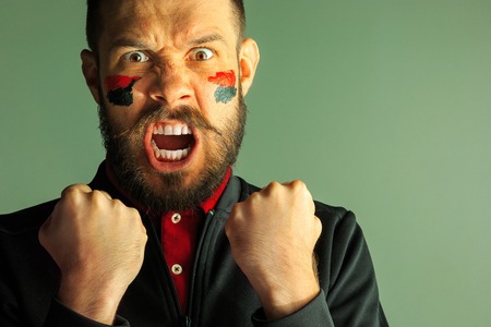 Portrait of a man with the flag of the Germany painted on him face.