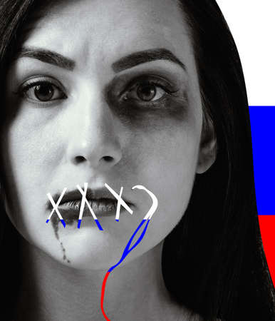 Man hand closes woman mouth, russian flag in the background. censorship concept, no personal opinion, closeup. woman resists the censorship