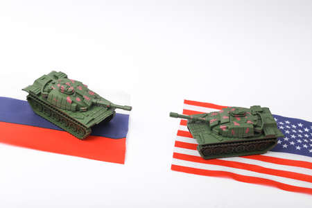 Toy tanks with USA and Russian flag on a white background. military conflict