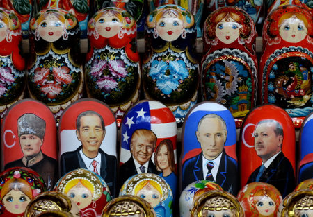 Nested dolls depicting world politicians Vladimir Putin, Donald Trump and Recep Erdogan on the counter of souvenirs in Moscow