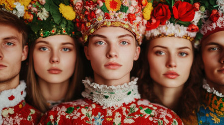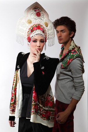 Pair models in exclusive design clothes on manners old-slavic.