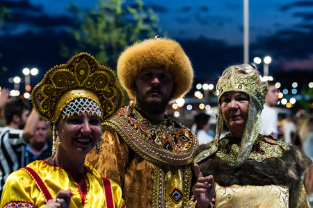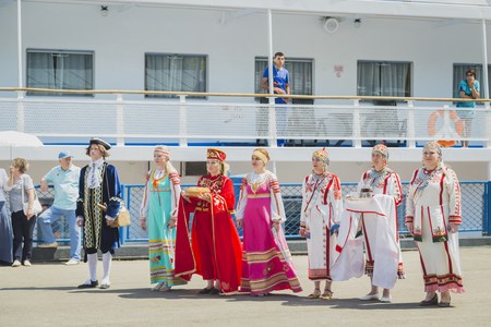 Tetyushi, Tatarstan, Russia - June 23, 2016. Girls and women in national dresses met with bread and salt passengers from ship