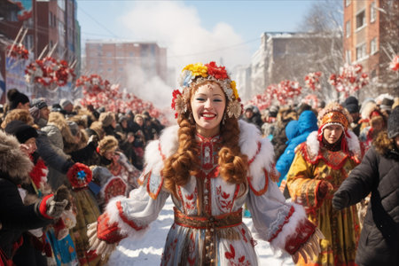 Orel, Russia, March 10, 2019: Maslenitsa selebration. Girl in red Slavonic carnival costume in crowd closeup