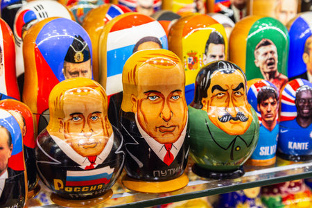 MOSCOW, RUSSIA - JANUARY 2, 2022: Matryoshka dolls depicting Russian President Vladimir Putin, Stalin in a souvenir shop