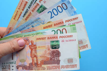 A stack of Russian banknotes. A bundle of Russian money on a blue background.