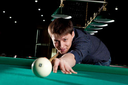 Cute man aiming a cue at a billiard ball. In the evening, a man relaxes and relaxes while playing billiards. A man hits the ball with a cue, aiming for a pocket on a billiard table.