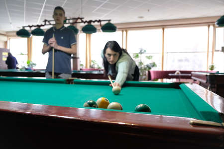 Woman playing in billiard pool hobby sport. Family sport leisure.