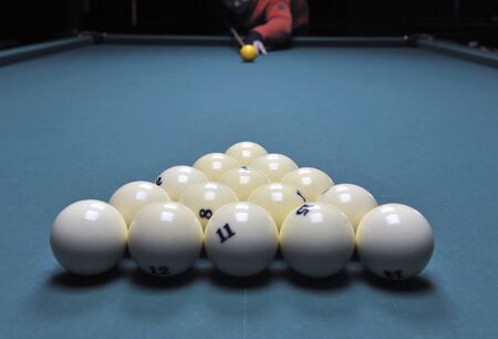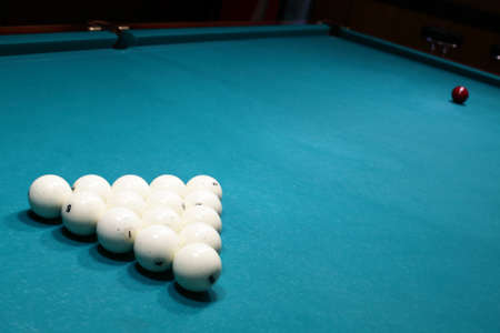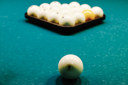 balls for Russian Billiards are lined with pyramid at the beginning of the game. white balls on a green table. serious sport, championship