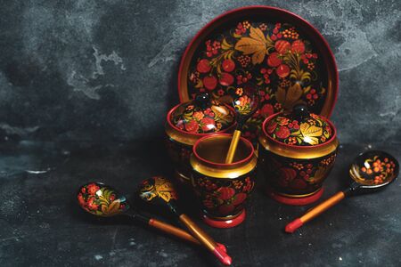 Russian khokhloma set, traditional wood painting handicraft souvenirs top view black background