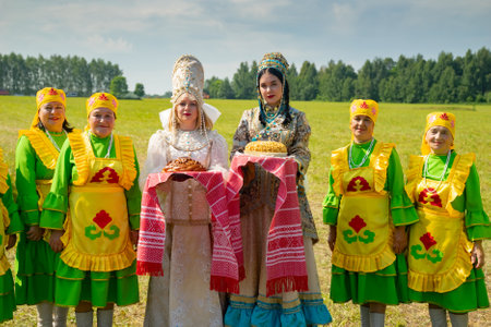 People in traditional russian clothes walking in a row on a meadow and singing a song