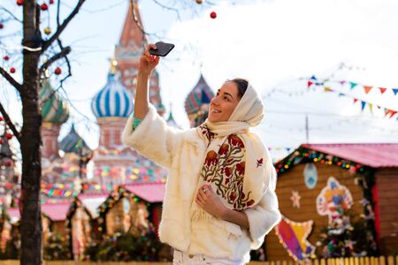 Selfie, Young beautiful girl photographed on a cell phone in red square, Moscow, Russia