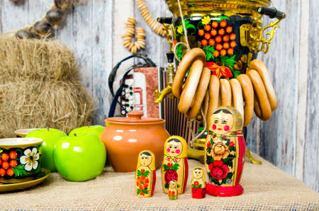 Russian traditions. Russian folk art and craft. Souvenirs and toys. Matryoshka dolls.