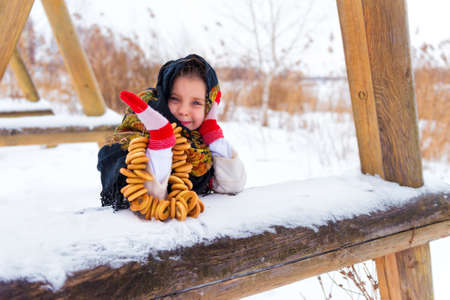 Ufa, Chishmy, Russia, 03.14.2021. The national holiday in Russia is Maslenitsa. Seeing off winter. A girl in a national Russian costume sells souvenirs.
