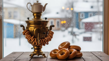 Samovar, bubliki, teapot, winter village view, cozy, still life