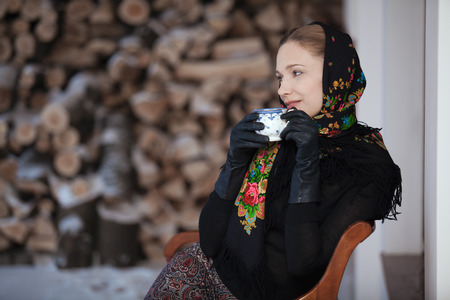 Winter portrait of blonde woman in traditional scarf with cap of tea