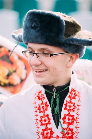 Gomel, Belarus - March 12, 2016: Portrait of unknown happy young man in funny national russian folk clothes at Celebration of Maslenitsa Shrovetide holiday.
