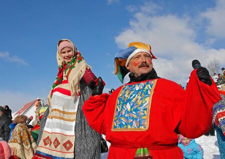 Gatchina, Leningrad region, RUSSIA - March 5, 2011: people play folk games, clowns fun and organized, actors dressed in national costumes, the choir sings Russian songs, performed folk competitions