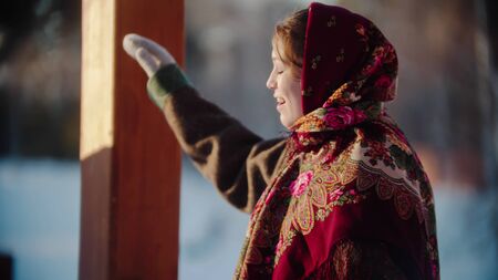 Russian folklore - a woman in a bright shawl standing outdoors in the winter forest - outdoor
