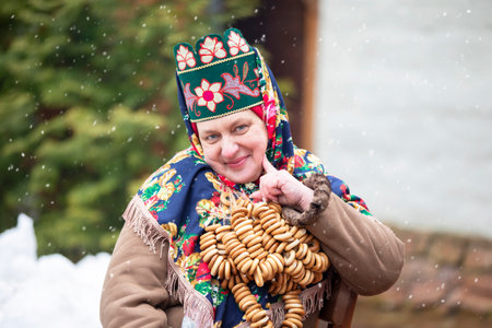 An elderly Russian woman in a kokoshnik with bagels at the Maslanitsa holiday.