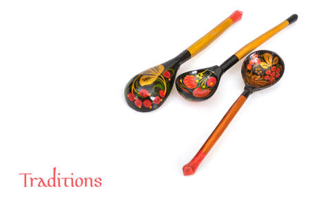 Traditional Russian national wooden painted (so-called Khokhloma) spoons isolated on white background