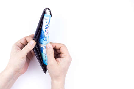 Close-up mens hands hold a wad of Russian money two thousand bills.