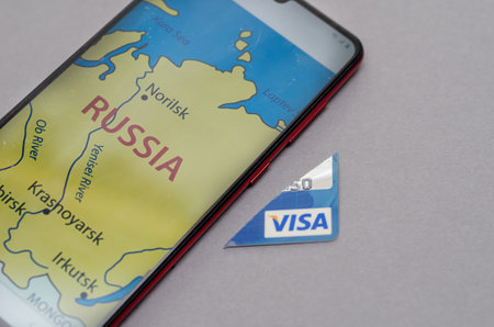 Smartphone and Visa Bank Card Piece against a gray background. There is a map of Russia on the smartphone display. A cut-off piece of blue credit card. Selective focus. Kiev, Ukraine - 01 05 2022.