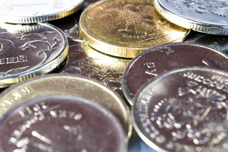 Russia money background. Heap of rubble banknotes. Currency top view. Money background with close up of russian Ruble A lot of Russian rubles. Iron money. Finance, business, investment concept.