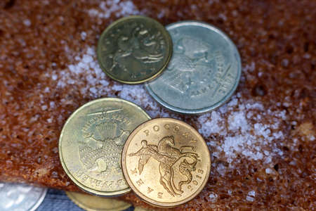 coin 50 penny between other rubles and bread with salt