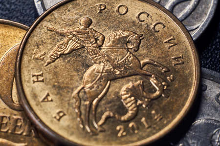 Russian ruble gold and metal coins on the russia flag