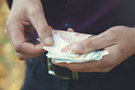 Man holds Russian money. Financial theme. Money in men's hands.