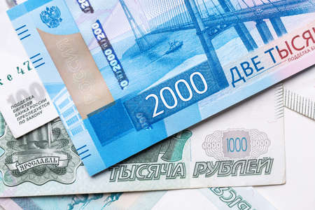 Bank notes Russian ruble cornish fabric background.Money and finance.Two thousandth and five thousandth denominations