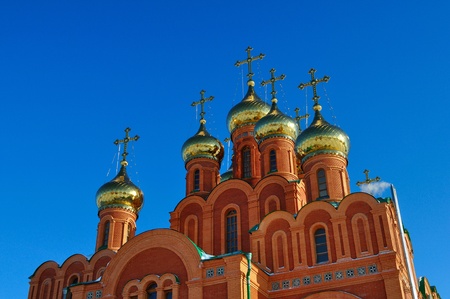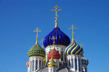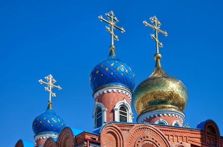 Domes of Russian Orthodox Church with crosses against the background of the blue sky.