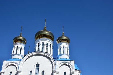 The Christian church is white with golden domes and crosses on a blue sky background. Orthodox architecture with elements of golden color.