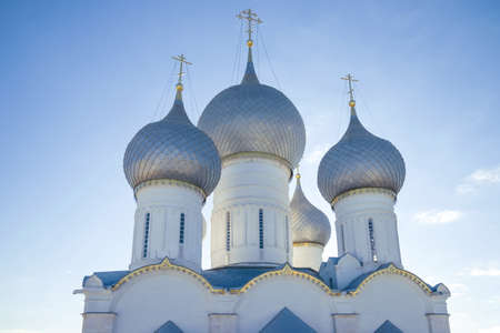 Domes of the Assumption Cathedral close-up on a sunny summer day. Rostov, Golden Ring of Russia