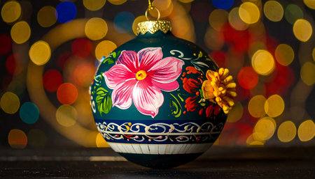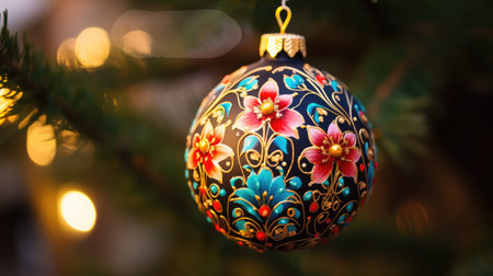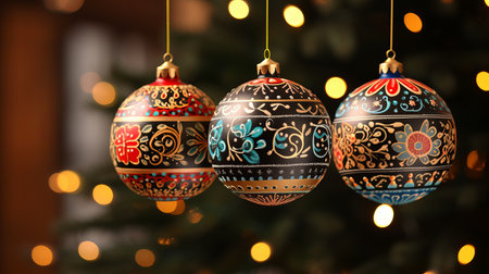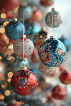 Colorful, hand-painted ornaments are elegantly displayed on a Christmas tree, surrounded by glimmering warm lights that create a festive atmosphere. The intricate designs add a unique charm.