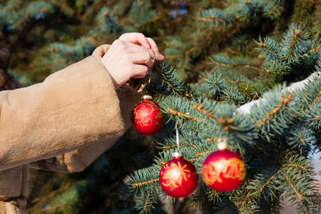 woman dressed in a fur coat hanging a christmas decorations on fir closeup. New year greeting card concept. Shallow depth of field
