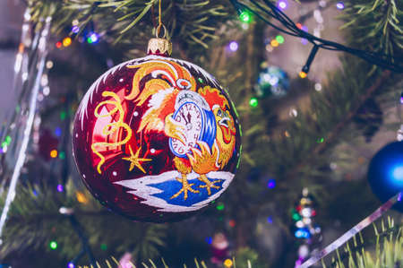 glass christmas ball decorated with rooster and clock hanging on fir tree branch